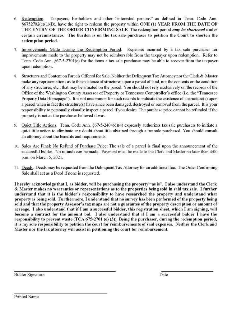 | GovEase will be hosting the 2021 Tax Sale for Washington County, Tennessee on March 4, 2021 at 10:00 A.M. EST on the GovEase auction platform. Registration is now open on the GovEase site, and the property list will be posted soon. Once you have electronically signed and/or uploaded all necessary registration documents, you must be approved on the GovEase site before you can bid on properties. We highly recommend that you review the articles and training videos prior to registration at this link . Pre-bidding for Washington County, TN is scheduled to open March 2nd at 10:00 AM EST. Please carefully read each registration form provided by the county for registration. If you are the successful bidder on a parcel, payment must be rendered according to the information provided on the registration documents. |